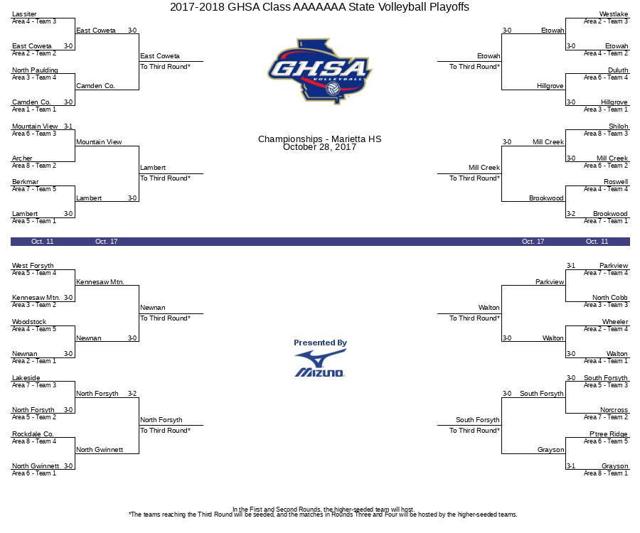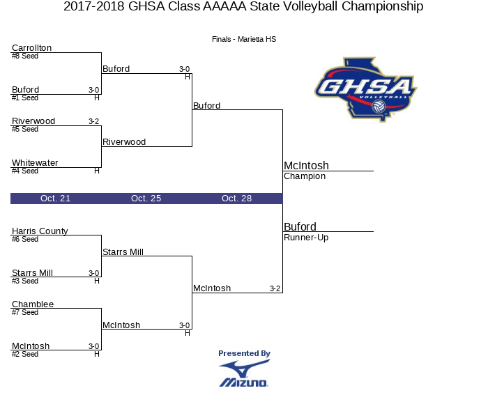 Ghsa Volleyball 2017 2022 Championship Bracket. If you are experiencing problems viewing the bracket make sure to clear your browser cache and cookies. State Volleyball Tournament - Second Round. 2021-2022 GHSA Class AAAAAAA State Volleyball Championship.